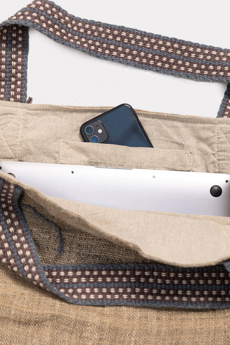 Bolso 100% cáñamo hecho con telar de mano. Todas las asas están hechas a manos mediante macramé artesanal. Cierre de imán. Cuenta con dos bolsillos internos, uno para el ordenador y otro más pequeño. El diseño del logotipo serigrafiado a mano está inspirado en elementos gráficos tradicionales de la papelería nepalí. Confeccionado a mano en Nepal.
