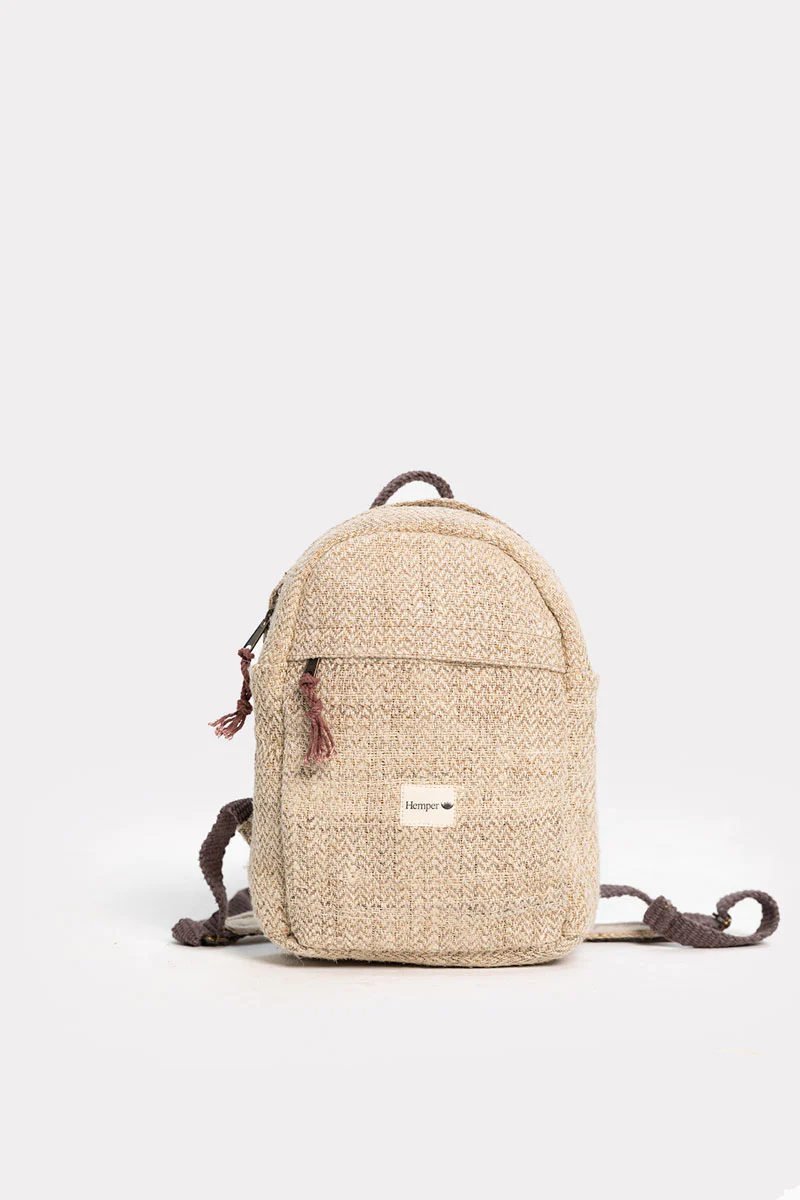 Mochila de cáñamo y algodón hecha con telar de mano. Esta mochila es la versión mini de nuestra mítica Annapurna. La mochila cuenta con dos bolsillos laterales y uno frontal. Confeccionada a mano. Confeccionada a mano en Nepal.